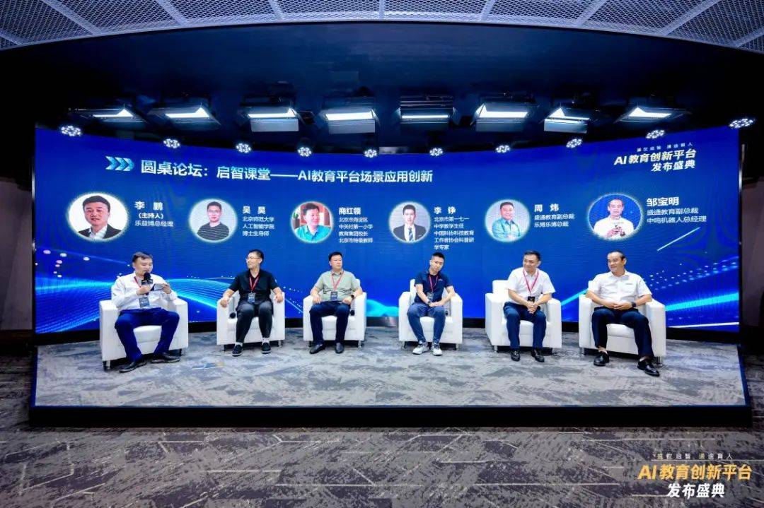 圆桌论坛环节,北京师范大学人工智能学院博士生导师吴昊,北京市海淀区中关村第一小学教育集团校长、北京市特级教师商红领,北京市第一七一中学教学主任、中国科协科技教育工作者协会科普研学专家李铮,盛通教育副总裁、乐博乐博总裁周炜,盛通教育副总裁、中鸣机器人总经理邹宝明围绕人工智能在教学中的应用场景、人工智能课程资源建设、人工智能平台的意义与价值、未来的人工智能课堂样态等问题进行了讨论。乐益博总经理主持圆桌论坛。